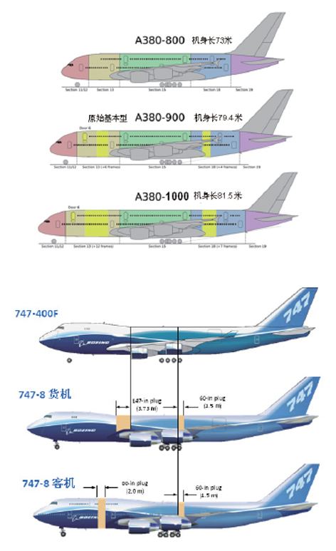 空客公司注意到,波音公司提出的407777-9X,仅仅是在368座的777-300ER基础上乘客数量增多10.6%。不难看到在这一前景良好的市场上,其飞机发展的乘客数量是逐步向上增加的,也不是马上填补A350-1000A380之间市场缺口。面对这一点,空客公司的竞争反应实际上是制定两个战略选择:第一个战略选择是进一步拉伸那已几经延迟数年的A350-1000客机的机身;第二个战略选择是搁置那较小A350-800变型,仅保留350座的A350-1000客机,而开发较大型的双拉伸机身的变型机种。