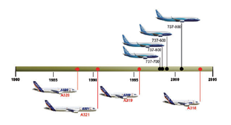 世界航空市场容量最大的是单通道窄体客机,如波音737系列和空客A320系列机。上世纪80年代以来这两种系列机的竞争及其发展情况,如图5所示。