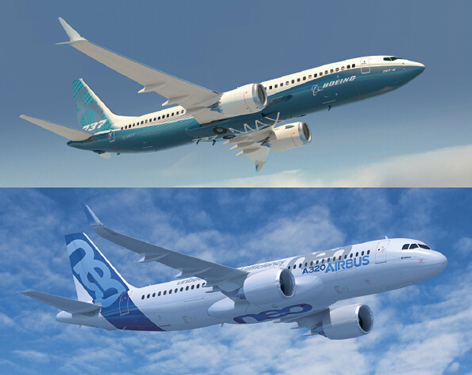 面对空客公司推出的A320neo系列机的竞争进攻,20118月,波音公司匆忙为737飞机启动了安装新发动机的衍生机型,在结构上也作了一些改进,翼梢小翼是V型结构,采用LEAP-1B发动机,并将其命名为737 MAX系列机,包括737 MAX 7737 MAX 8737 MAX 9,如图10所示。737 MAX系列机将为航空公司带来未来成功竞争所需要的,更低的燃油成本。以便与空客公司的A320neo继续竞争,到20121737MAX系列飞机确认订单1100架,计划在2017年完成首架交付。图11所示为波音737 MAX和空客A320neo客机的外形比较。