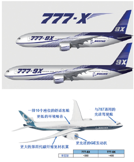 波音公司在上世纪90年代初研制了777系列全新机种,是世界上最大的双发宽体客机,销售形势也较好。但是,随着空客公司A350客机研制的进展,波音公司感到压力越来越大。特别是A350-1000的载客量与777-300ER相近,其航程还更远,将在350客座段客机市场非常有竞争力,是最省油的飞机。而且777客机毕竟已有20多年历史,面对机身和机翼全是碳纤维复合材料制成的A350-1000的竞争,波音777难以抵挡。为此,波音董事会在20 134月决定授权波音商用飞机部门向航空公司提供波音777飞机的衍生机型波音777-X。针对300-400座位段客机市场的不断发展,波音将开启为期6年的研发工作,下大力气改进777-300ER777-X,用以填补350座到400座客机空档,并抵挡空客公司A350竞争性的追赶,如图12所示。该机型最终计划在2019年投入运营。