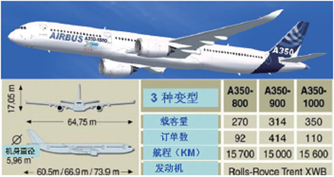 空客在研制超大型客机A380 期间,因公司管理松散和技术问题,在总装配时发现严重不协调问题,导致50亿欧元的巨大损失,技术储备和财力几乎耗尽。在和波音 787 竞争的 A350XWB 客机(如图17所示)研制中又一波三折,开始时采用 A330 机身截面的基本设计以及仍然采用铝合金机身,遭到业界的强烈批评及用户的反对,只得重起炉灶加宽机身,并采用碳纤维复合材料机身,这样大大提高了成本,研制进度推迟了3年时间,打乱了空客公司的发展计划,A350-9002013614日试飞成功。很明显,现在空客公司无力再开发全新机种来应对波音777-X的挑战。这样在2020年前,空客A350-1000A380之间的客座段留下了很大市场缺口,给了波音777-300ER747-8777-X较好的发展机会。