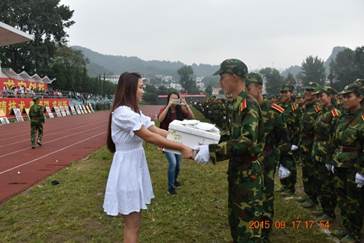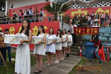 9月17下午,在一片欢呼声中,身着白裙的矿业礼仪小姐依次为学校包括土木、经管、机械等学院在内的共7个学院送去了“新生生日趴”蛋糕,并赢得各个学院的好评与赞扬。当天晚上,矿业工程学院在新生军训场地沙地足球场为本学院新生举办了生日晚会。在14、15级辅导员及9月份即将过生日的新生发言之后,晚会正式开始。新生老生在一起唱生日歌、切蛋糕、吃蛋糕及交流谈心,大家很快“打成一片”。对于新生的各种提问,学长学姐的耐心回答,使得彼此间友谊更深厚。