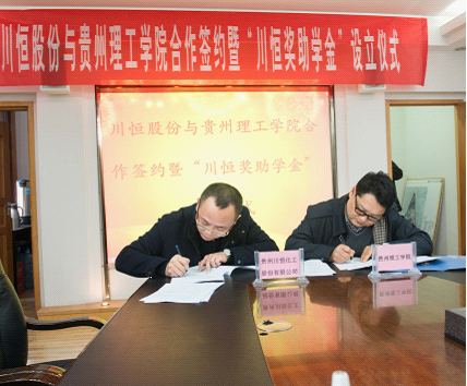 11月12日下午,贵州川恒股份有限公司与pp电子合作签约暨“川恒助学金”设立仪式在综合楼五楼第一会议室举行,副校长宋建波与贵州川恒化工股份公司总经理吴海斌在协议书上签字。贵州川恒化工股份公司研发部工程师李剑秋、人事部经理文利、pp电子发展与规划处宋卓兖、化学工程学院院长唐安江、部分教师、学生代表参加仪式。