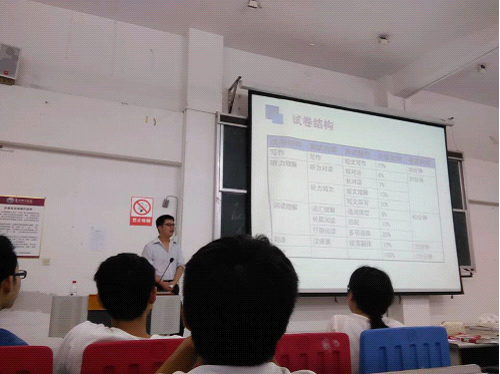 根据试卷结构分值比例,吴德智老师就写作和听力两方面为同学们进行了讲解。他建议大家写作文分三段,万能句子千万要牢记,同义词替换更不可缺;接着,他将听力考试的不同类型解题技巧、易得分点和自己的一些经验与大家分享。在讲座过程中,吴德智老师结合一些生活中的例子,以其幽默风趣的演讲方式给同学们传授着知识,同学们听得津津有味,现场气氛十分活跃。