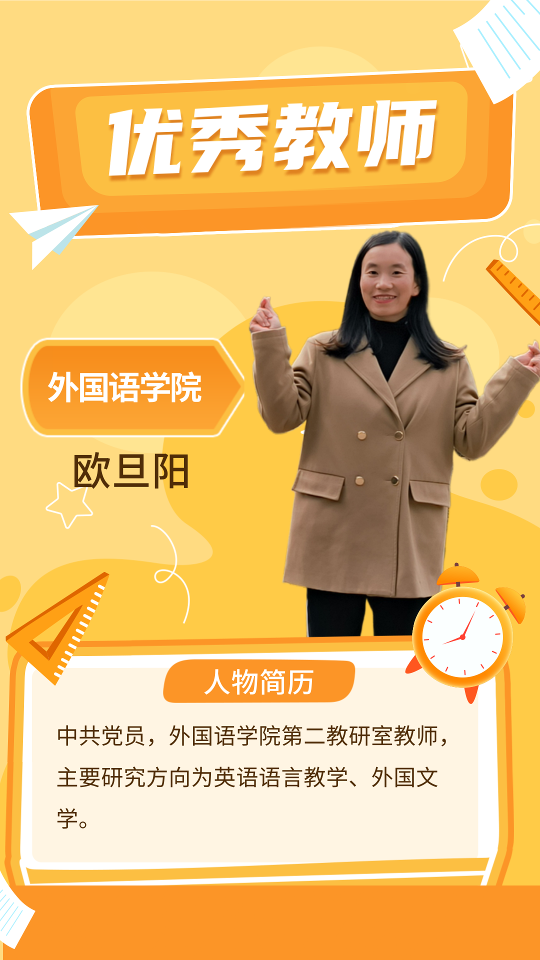 2022年欧旦阳老师所在的周丽教授团队以大学英语课程为依托,成果《基于OBE理念的大学英语“一体两翼”教学模式探索与实践》荣获贵州省第十届高等教育省级教学成果一等奖。获得“外研社杯”全国英语写作大赛贵州省赛区指导教师二等奖。主持建设的《大学英语3》获批省级一流课程,教学团队获批校级黄大年式教学团队。立足贵州区域文化的外宣和发展,结合自身学科,主持完成贵州省教育厅人文社科项目——旅游产业化背景下贵州旅游翻译问题及对策研究,发表学术论文4篇。
