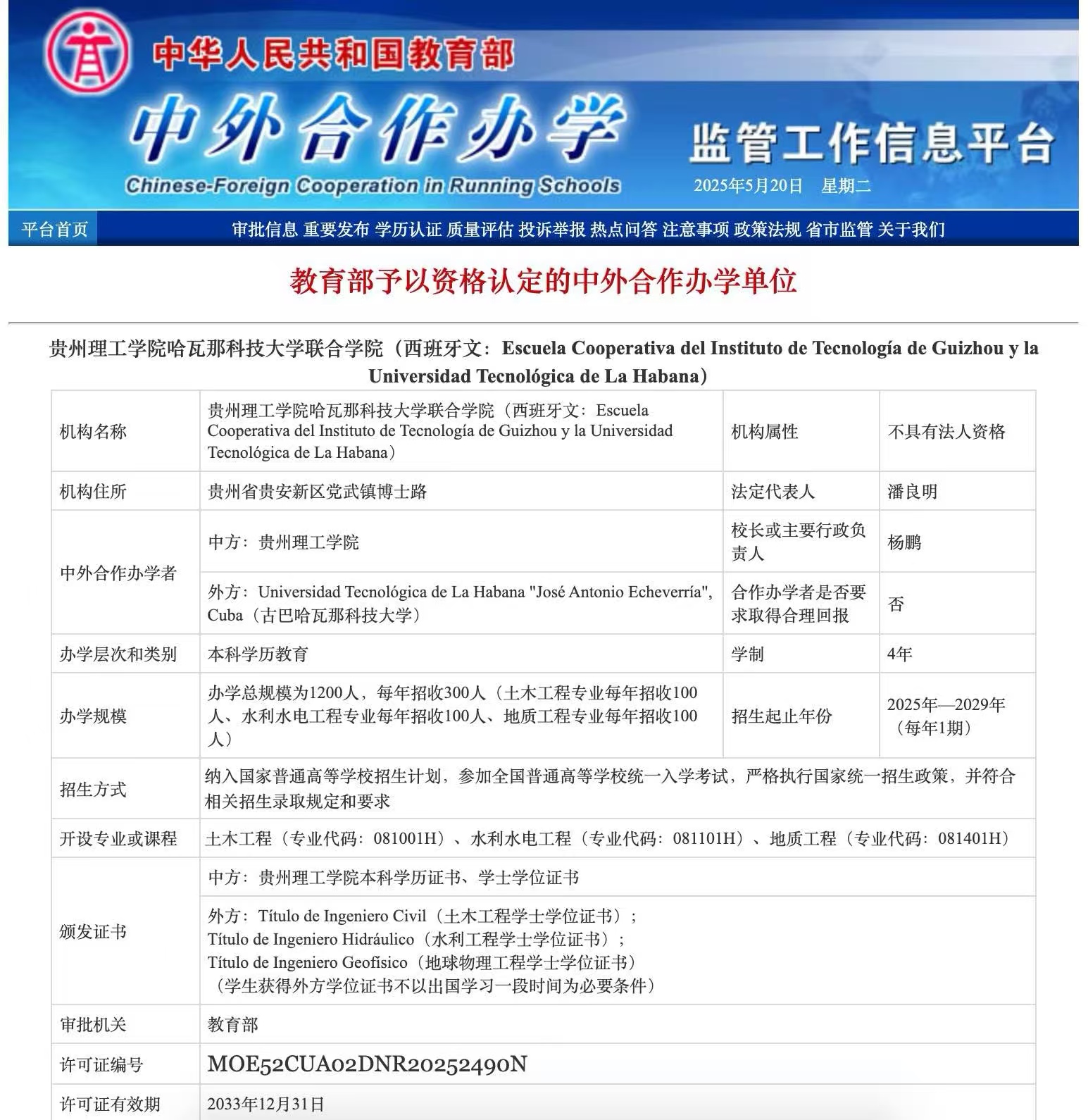 近日,教育部中外合作办学监管工作信息平台传来重磅喜讯:pp电子与古巴哈瓦那科技大学合作设立的pp电子哈瓦那科技大学联合学院正式通过教育部资格认定,成为学校首个获教育部批准成立的中外合作办学机构,是中拉首批工程类合作办学机构,也是全国为数不多用西班牙语授课的工程类中外合作办学机构,为中拉文明互鉴与科技教育融合开辟了全新路径。
