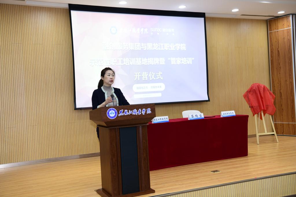 接下来,副校长王明海发表致辞。他首先介绍了当前党中央、国务院对于职业教育的重视程度,习近平总书记对职业教育提出了新的要求,肯定了职业教育的重要地位,指出了职业教育新的办学格局和方向。国务院出台了系列政策文件,倡议职业教育携手行业龙头企业,为国家发展培养高素质技术技能人才。接着,他介绍了学校的办学历史、办学理念和优势以及工商管理学院为服务龙江经济培养优秀人才的突出表现。他表示,学校将大力支持与融创服务集团的产教融合项目,希望双方在现有基础上开展更加深入的合作,开发出更多建设性成果。未来为龙江区域经济发展、融创集团发展、学校学院建设作出更加卓越地贡献。
