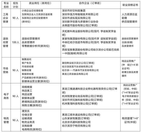 williamhill官方网站工管学院被誉为“龙江商贸经济的摇篮”。各专业均是“龙职”和“龙江”的品牌专业,是黑龙江省同类专业招生报考人气最旺的专业。工商管理学院引真实企业项目进校园,与黑龙江省电视台联合,与世界五百强零售企业、国内知名企业进行现代学徒制人才培养,为企业提供拥有商业大数据分析能力、项目运营管理能力、全渠道集客销售能力、数字化营销能力、新媒体技术应用能力、客户关系管理与运维能力、物流规划管理能力的复合型技术技能商业领域杰出人才!学生入学后经双向选择即可进入相应的现代学徒制班,实现入学即入职,毕业即就业。学院近3年初次就业率平均达90.16%,用人单位对毕业生满意率平均达95.06%,毕业生就业对口率平均达94.98%。毕业生分布北京、上海、深圳、杭州、昆山、黑龙江等地区,毕业三年后精英校友工作年薪达20万以上。